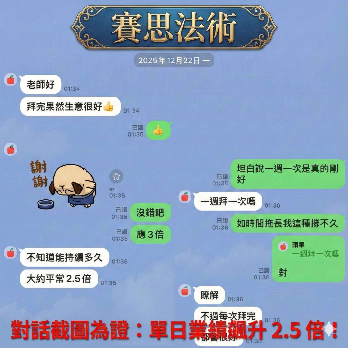 圖說: 客戶與賽思老師的真實對話記錄。從原本的例行拜拜,到老師施法加持後的業績爆發,數據會說話。
