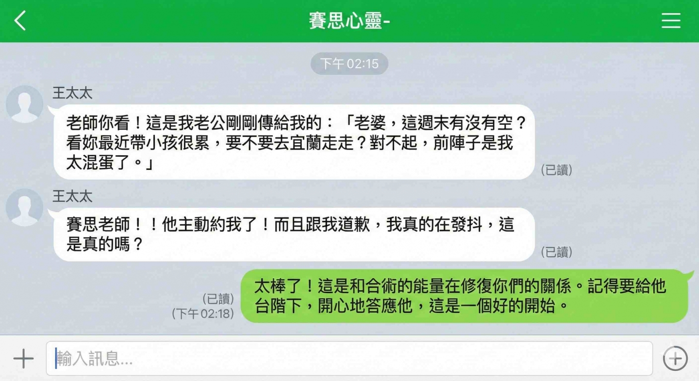 老公突然傳訊息道歉,並主動邀約旅行。王太太激動地截圖傳給老師。